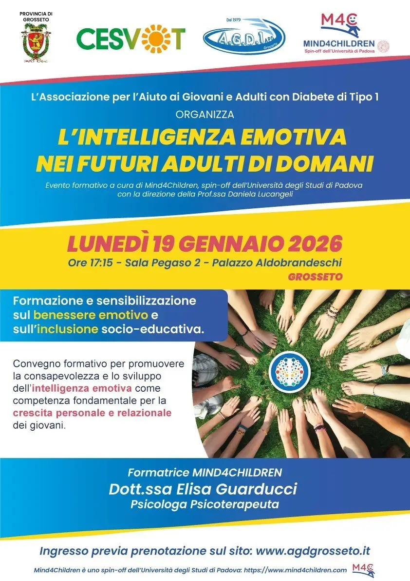 L'Associazione per l'Aiuto ai Giovani e Adulti con Diabete di Tipo 1 – Grosseto organizza una Lectio Magistralis dedicata al ruolo dell'intelligenza emotiva e della gestione delle emozioni nella costruzione di relazioni sane e inclusive, con particolare attenzione alle esperienze vissute da persone con malattie croniche.